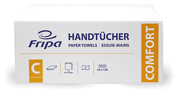 Fripa COMFORT Handtücher aus 100% Zellstoff sind spürbar sanft und angenehm weich. Erhältlich in verschiedenen Falzarten sind sie für verschiedene Handtuchspender geeignet.
