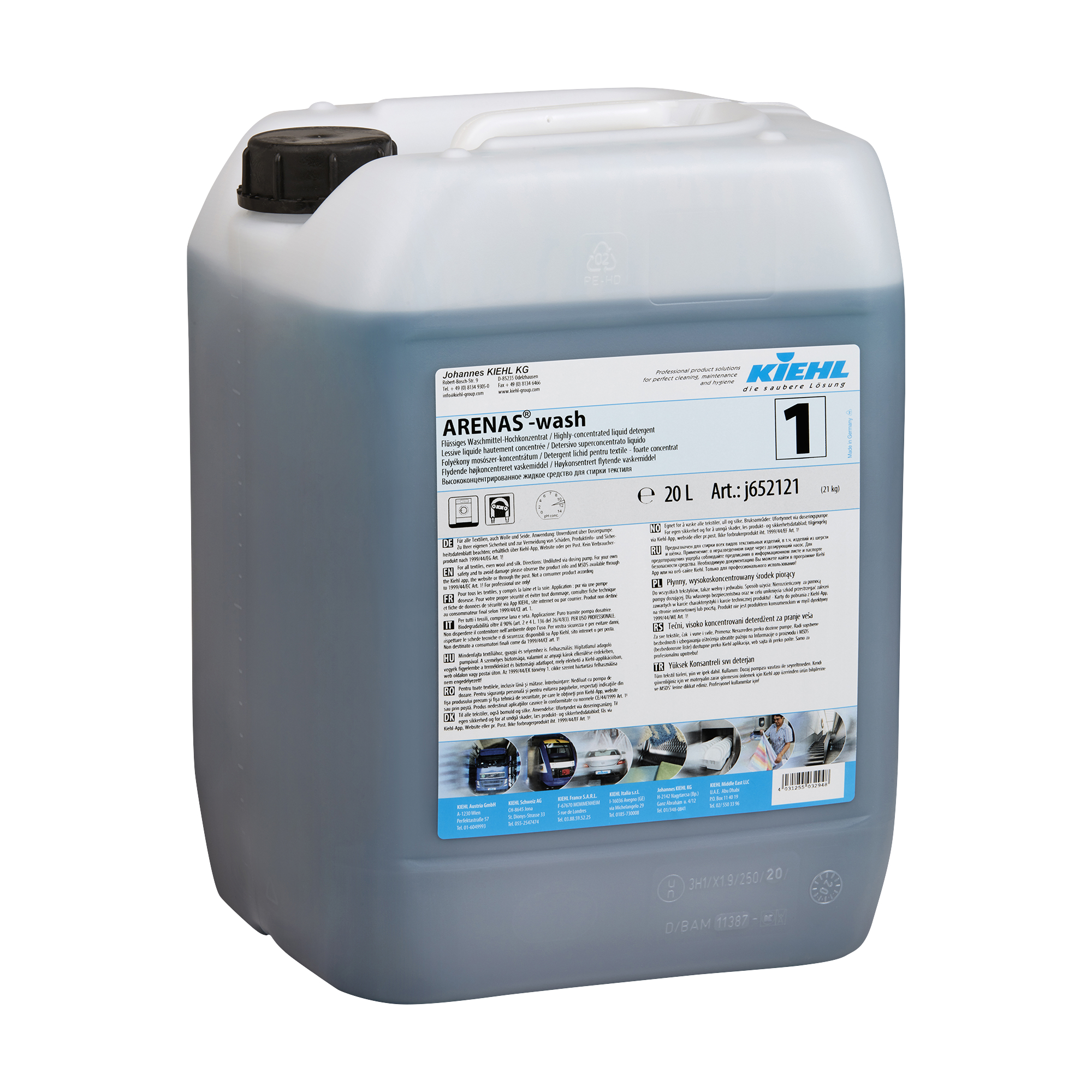 Das Kiehl ARENAS-wash ist ein flüssiges, hochwirksames Alleinwaschmittel, das für die Reinigung von Bunt- und Weißwäsche sowie Reinigungstextilien im Temperaturbereich von 30 bis 90 °C entwickelt wurde. Es ist ebenso sanft zu empfindlichen Materialien wie Wolle, Seide und Funktionskleidung und bietet eine exzellente Waschleistung. Dank seiner umweltfreundlichen, phosphatfreien Formel auf Basis nachwachsender Rohstoffe überzeugt das Waschmittel sowohl durch Nachhaltigkeit als auch Effizienz.