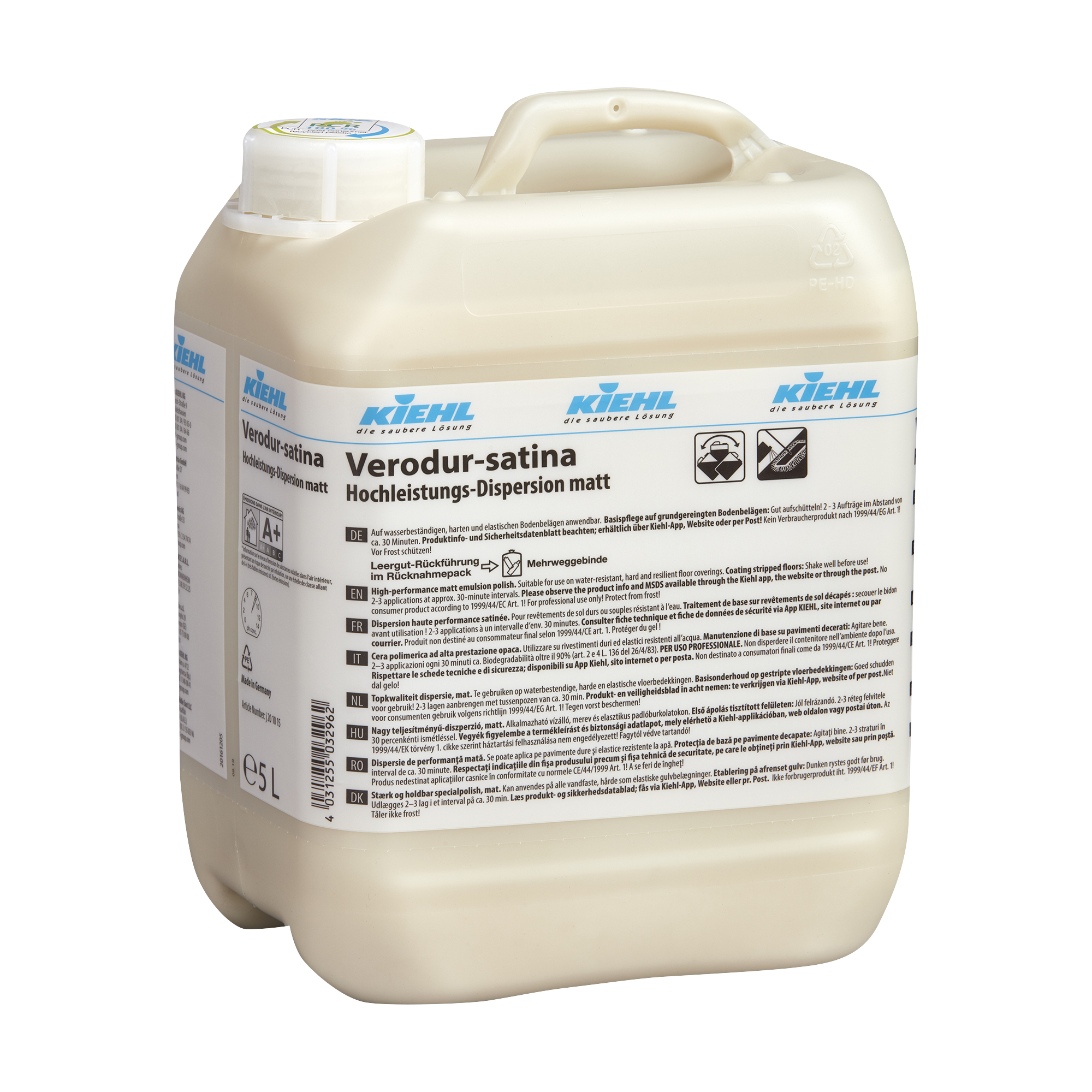 Die Kiehl Verodur-satina ist eine hochwertige, seidenmatt auftrocknende Kunststoffdispersion, die speziell für den Schutz und die Pflege von Bodenbelägen entwickelt wurde. Diese Hochleistungs-Dispersion sorgt für eine besonders strapazierfähige, schmutzabweisende, wischfeste und rutschhemmende Oberfläche. Der matte Pflegefilm bleibt selbst durch Polieren unverändert und ist beständig gegen Flächendesinfektionsmittel, was sie ideal für hygienisch anspruchsvolle und stark beanspruchte Bereiche macht.
